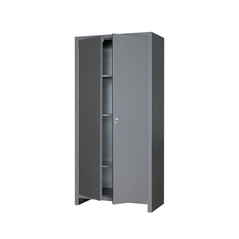 Armadio Multifunzione per Esterni, a 2 Ante e 3 Ripiani, realizzato in lamiera zincata spessore 8/10, con verniciatura a forno in epossipoliestere grigio e chiusura con serratura a cilindro. Armadi fornito smontato in imballo di cartone.